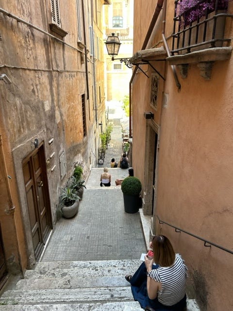 Speaking of religions I’m bivouacked in the Jewish ghetto on Via Di San Simone, a tiny gash of a street that dead ends into a five-hundred year-old stone and marble staircase leading up to my hotel, which isn’t even really a hotel it’s more like a small monastery with snazzy bathrooms.