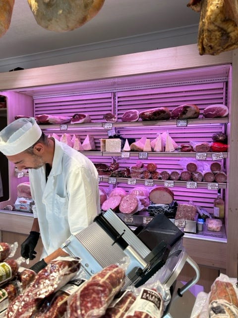 I get to my hotel with my bag full of treasures (from this afternoon, not last night and the kid with the face). A beautiful ball of bufala, eight slice of the San Daniele (I ordered six but it was so buttery I succumbed to two more). A slice of harder cheese, dealer’s choice. Then over to the grilled and marinated eggplant (two different kinds), some artichoke hearts and marinated peppers and that’s lunch for a growing boy. Yeah, go head, throw in a hunk of bread. Do I need a teeny can of olive oil or I can use what’s in the Eggplant? The old salumi master nods about the oil from the eggplant.