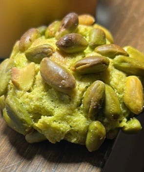 “What’s that?” I say pointing to a green blob studded with whole pistachios.