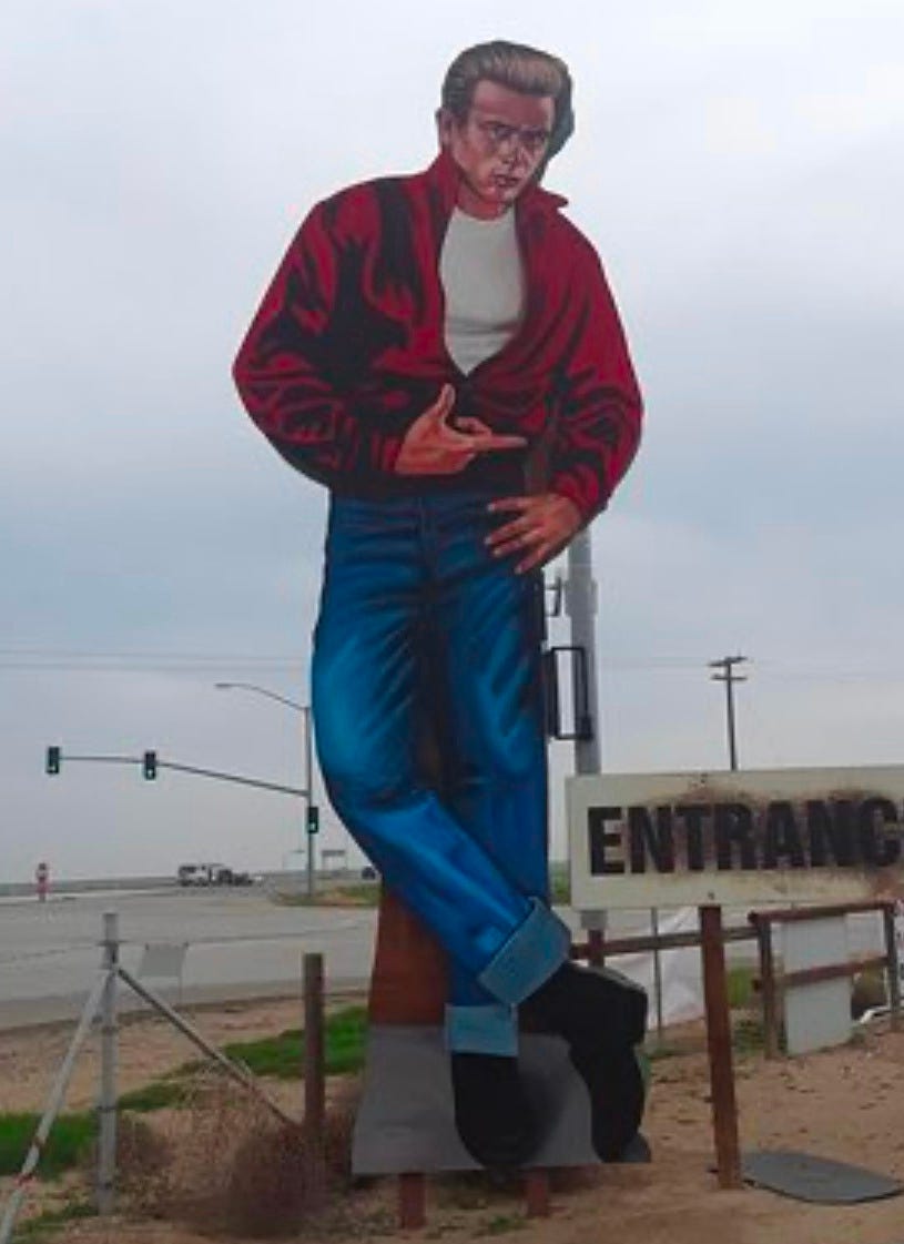 They got a gas station/rest stop/store up there, and his giant, plywood image looms over the flattop. It’s the classic Dean: legs crossed at the ankle, one hand on his blue-jean hip, a cigarette in the other. He wears motorcycle boots, the cranberry windbreaker over a white tee. This is the Dean we know best. Not an actor, but an icon; a celluloid Jesus, nailed to the cross of cool.