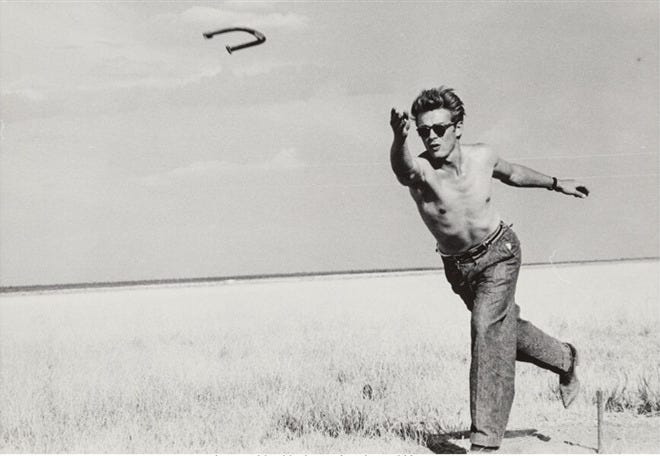 What you need to understand about James Dean is, he isn’t an actor; he’s a dancer. Watch him in East of Eden (his first and greatest performance) and you’ll see him hurling his body from scene to scene. He slinks, he slithers, weaving and bobbing, leaping and lunging, flinging himself at his bible-clutching father, trying to win his love. There’s a famous shot where he rides atop a freight train, origami-ing himself into a grimy sweater, then leaping off like Baryshnikov. You’d think the director was Martha Graham, not Elia Kazan.