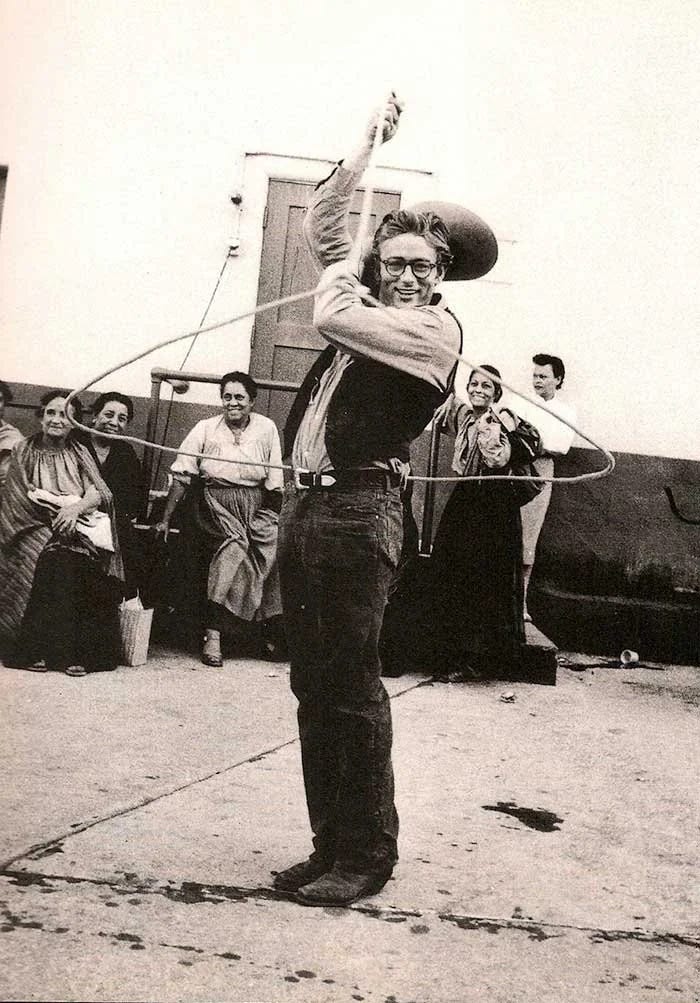 My favorite shot is one of him on the set of Giant. He’s goofing around, standing inside a spinning lariat like the nucleus of an atom, a group of female Mexican extras in the background. It’s the look on his face that gets me, the bookish glasses and all that dimpled joy, the posture halfway to Flamenco. Whatever “it” is he’s got his own special batch, which is why he will always be remembered—Just not for who he really was.